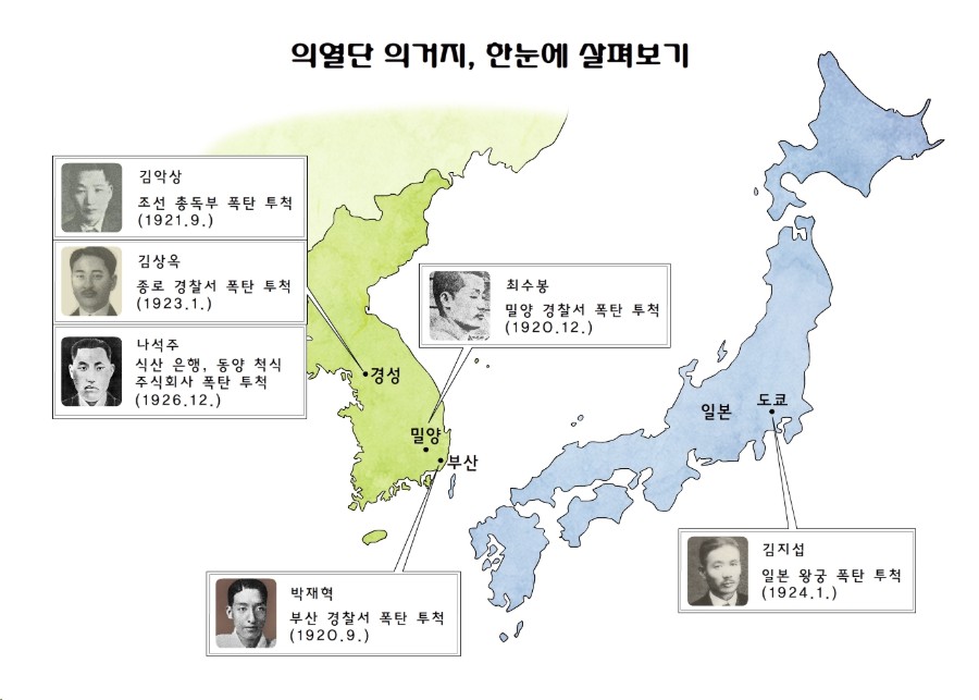 부산 경찰서 폭파 사건은 의열단의 첫 쾌거였어요. 의열단은 목표를 실현하기 위해 1920년부터 1926년까지 총 11개의 거사를 계획하고 실행했어요. 이중 우리가 앞에서 살펴본 박재혁 의사의 의거처럼 성공한 것도 있고 밀양 폭탄 반입 사건처럼 실패한 것도 있었어요. 지금부터 의열단이 펼친 의거 활동을 자세히 살펴볼까요?