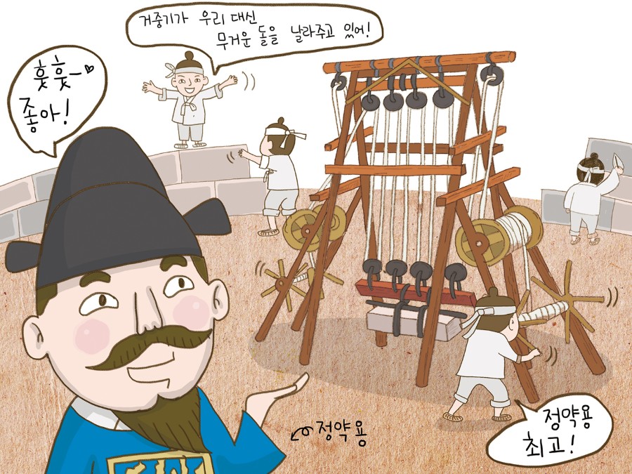 정약용은 서양인 신부가 편찬한 『기기도설』이라는 책을 참고해 도르래를 이용한 거중기라는 기구를 발명하였어요.