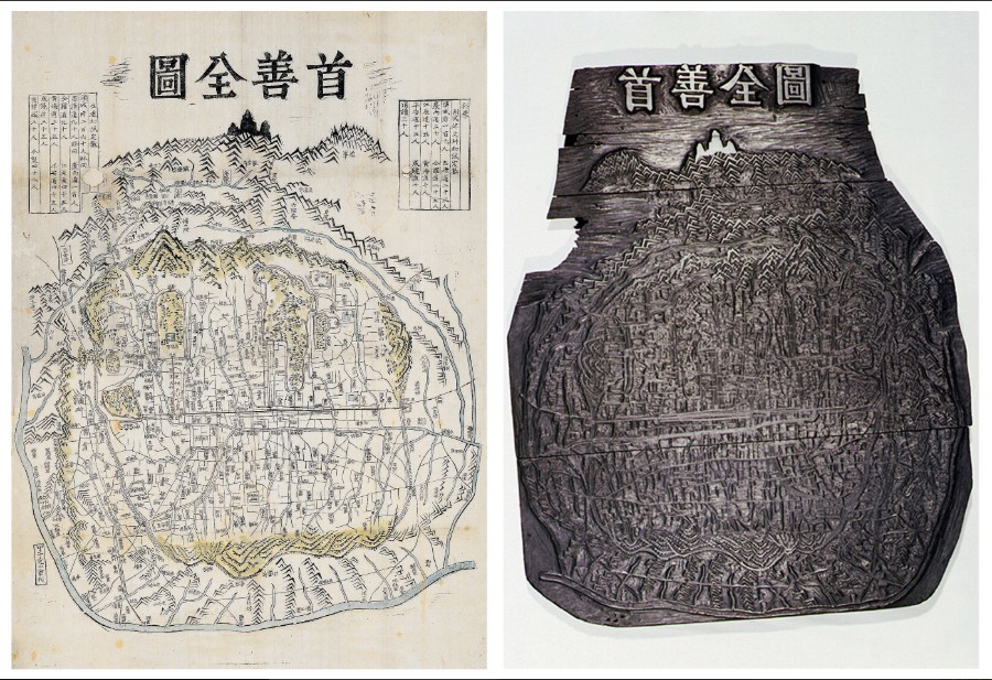지도의 중요성을 알고 있는 김정호와 최한기는 많은 사람들이 지도를 널리 볼 수 있기를 바랐어요. 김정호는 최한기의 부탁을 받아 세계지도인 ‘지구전후도’를 목판으로 새겼어요. 그리고 몇 해 뒤 서울의 모습을 담은 ‘수선전도’를 만들어 목판으로 제작했어요.