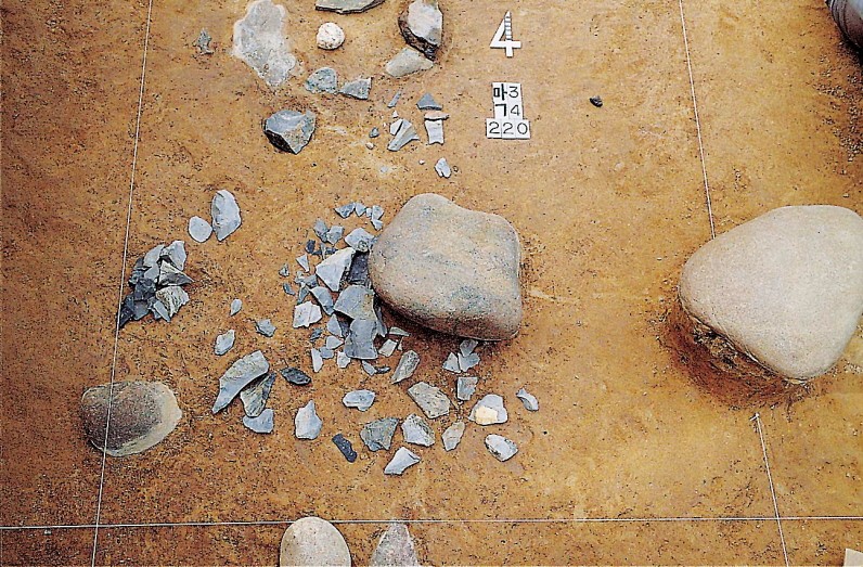 단양 수양개 유적에서 특별한 유물이 발굴되었어요. 바로 뗀석기를 만든 흔적이 남아 있는 석기 제작소에요. 모루돌과 몸돌, 그리고 떨어진 조각돌(격지)이 출토되었어요. 이를 통해 구석기 시대 사람들이 어떻게 뗀석기를 만들었는지 알 수 있게 되었어요.
