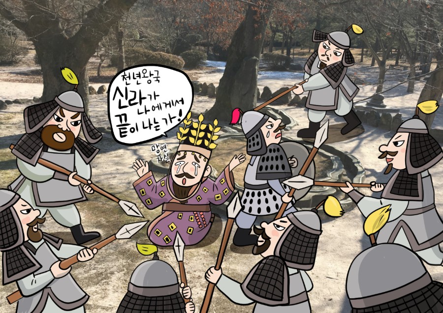 신라가 고려의 편에 서서 움직이자 견훤은 고려와 신라 사이를 끊기 위해 군사를 이끌고 신라를 공격하였어요(927년). 경애왕은 고려에 구원군을 요청했지만, 고려군이 도착하기도 전에 후백제군은 서라벌로 쳐 들어가 포석정에서 경애왕을 생포하였어요. 견훤은 자신을 따르지 않던 경애왕과 많은 왕족들을 죽이고 왕궁을 약탈하였지요.